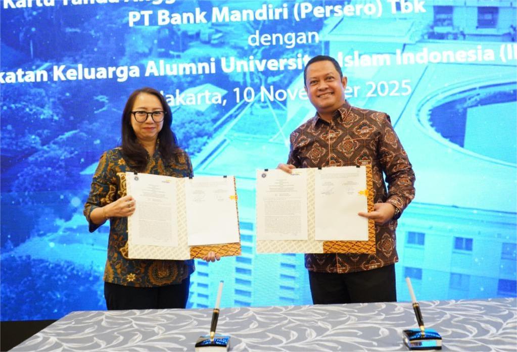 Penandatanganan perjanjian dilakukan Senior Vice President Commercial Solution Bank Mandiri Anggi Mutiara dan Ketua Umum DPP IKA UII Ari Yusuf Amir di Jakarta, Senin (10/11/2025) disaksikan perwakilan Manajemen Bank Mandiri.