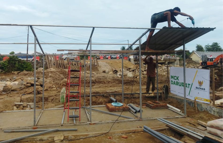 Badan Amil Zakat Nasional (BAZNAS) membangun fasilitas mandi, cuci, kakus (MCK) darurat bagi warga terdampak banjir di Desa Manyang Cut, Kabupaten Pidie Jaya, Aceh, untuk memenuhi kebutuhan sanitasi dasar masyarakat di tengah kondisi darurat.