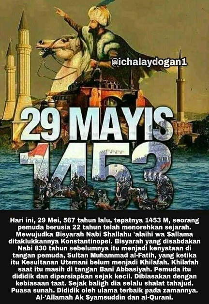 semarak.co-Hari ini 29 Mei, 568 tahun lalu, tepatnya 1453 M, seorang pemuda berusia 22 tahun telah menorehkan sejarah. Mewujudkan Bisyarah (Kabar Gembira) Nabi Shallahu ‘alaihi wa Sallama ditaklukkannya Konstantinopel.
