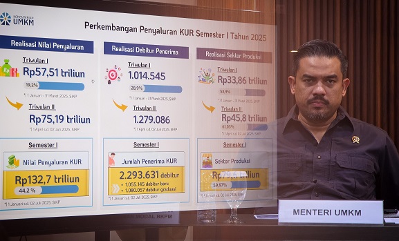 Dari sisi pembiayaan, secara kuantitas, realisasi penyaluran KUR nasional sampai 02 Juli 2025 mencapai Rp132,7 triliun (44,2 persen dari target) dengan penerima manfaat dari program KUR mencapai 2,29 juta orang (65,5 persen dari target).