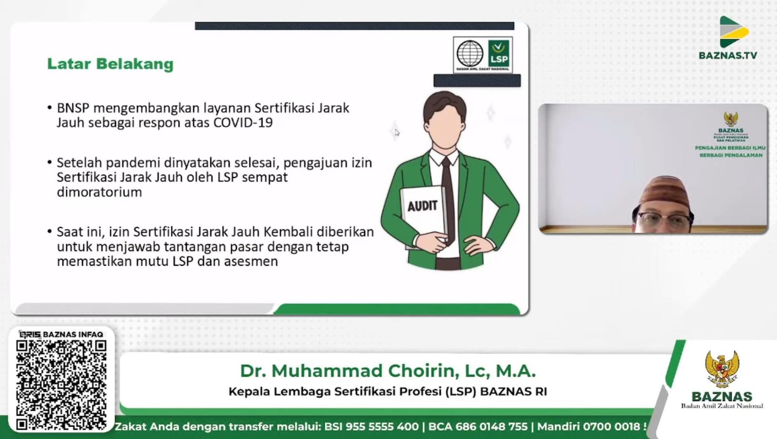 Kepala LSP BAZNAS Muhammad Choirin menjelaskan, izin pelaksanaan Sertifikasi Jarak Jauh diperoleh melalui SK Ketua BNSP No. KEP.2251/BNSP/IX/2025. Ia menegaskan, meski daring, proses asesmen tetap mengikuti ketentuan dan standar mutu yang ketat, termasuk penggunaan kamera pengawas selama ujian berlangsung.
