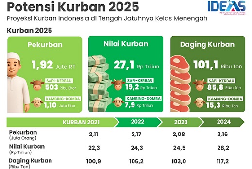 Lembaga Riset Institute for Demographic and Affluance Studies (IDEAS) melakukan kajian terkait dengan potensi ekonomi kurban pada 2025. Simulasi IDEAS menunjukkan prediksi terjadi penurunan proyeksi Jumlah pekurban tahun ini dibanding 2024.