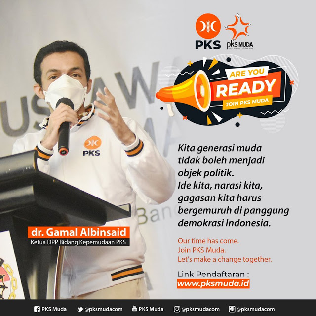 Ketua Bidang Kepemudaan DPP PKS dr. Gamal Albinsaid mengajak para pemuda dari seluruh penjuru Indonesia untuk bersama-sama bergabung dengan Partai Keadilan Sejahtera (PKS).