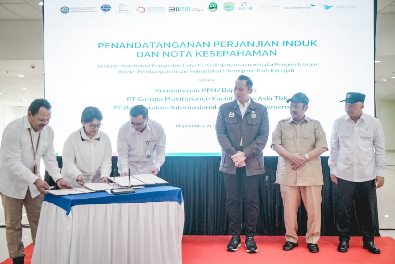 Kementerian PPN/Bappenas, PT Garuda Maintenance Facility Aero Asia, dan PT Bandar Udara Internasional Jawa Barat (Perseroda/BIJB) menjalin kerja sama soal penguatan industri kedirgantaraan melalui pengembangan Sustainable Aerospace Park Kertajati di Majalengka.