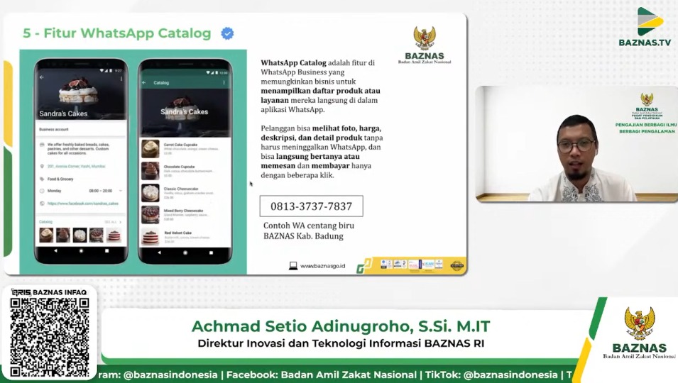 “WhatsApp jenis Business API (Application Programming Interface) yang telah digunakan BAZNAS memungkinkan penggunaan fitur-fitur canggih seperti WhatsApp Ads, link donasi, broadcast pesan, flow interaktif, dan katalog donasi, yang sangat efektif,” jelasnya.