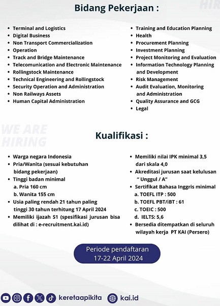 Serta akreditasi jurusan/program studi pada saat tanggal kelulusan minimal Unggul (A) dari BAN-PT atau lembaga yang berwenang. Masyarakat yang ingin melamar dapat melakukan pendaftaran mulai 17 s.d 22 April 2024. “KAI memberikan kesempatan kepada putra-putri terbaik bangsa untuk bergabung dan berkarier di KAI melalui rekrutmen ini,” imbuh Joni.