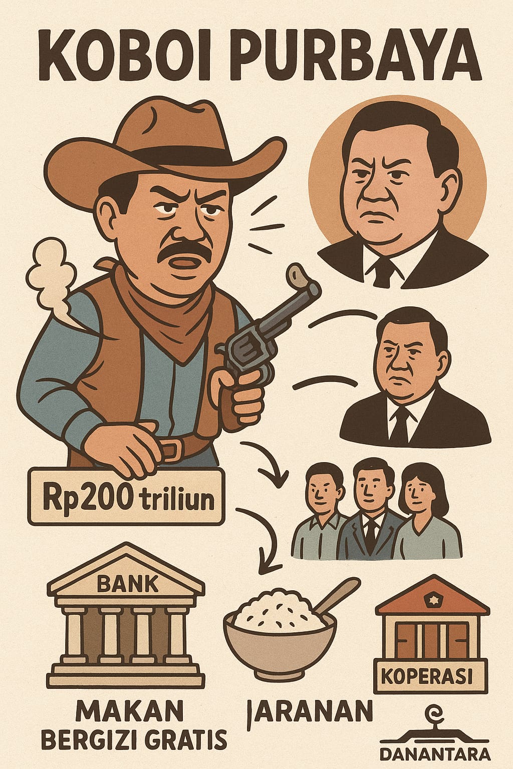 Purbaya ingin menata ulang sirkulasi uang agar “tidak ke konglomerat lama – dia lagi-dia lagi”. Namun, seperti di film koboi, niat baik sering terjebak di tengah debu dan asap kuasa jahat para penguasa ekonomi-politii.