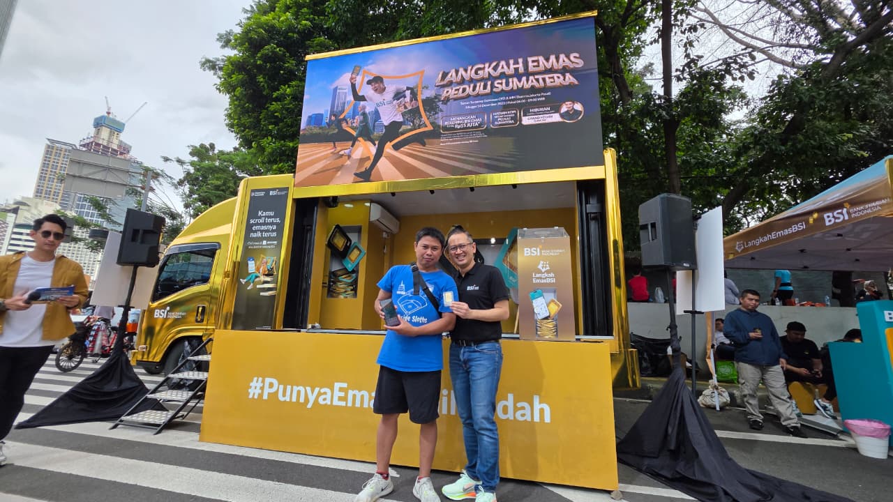 PT Bank Syariah Indonesia (BSI) mendukung event Langkah Emas Peduli Sumatra yang digelar di Taman Sumenep, Jakarta Pusat. Acara ini diisi dengan berbagai kegiatan, seperti zumba, donasi bencana Sumatra bersama BSI Maslahat, pembukaan rekening BSI Emas dan lain-lain.