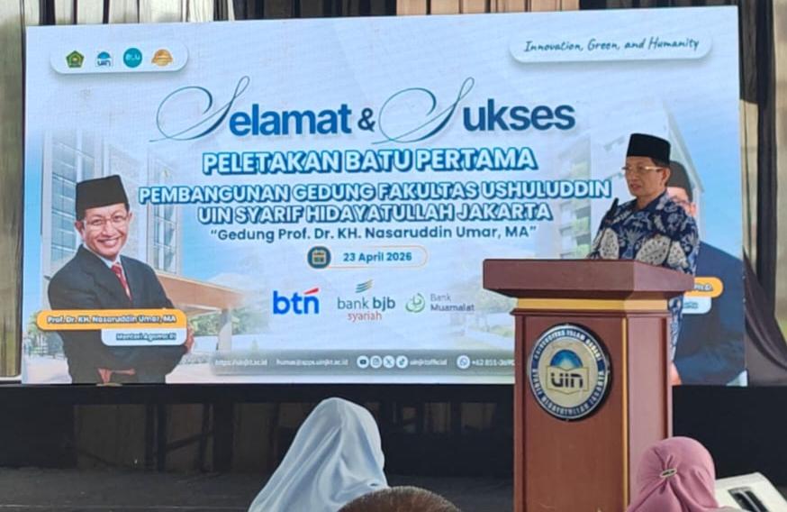 Menteri Agama Nasaruddin Umar meresmikan pembangunan gedung baru Fakultas Ushuluddin UIN Syarif Hidayatullah Jakarta dengan ditandai proses peletakan batu pertama pembangunan gedung, Rabu (23/4/2026).