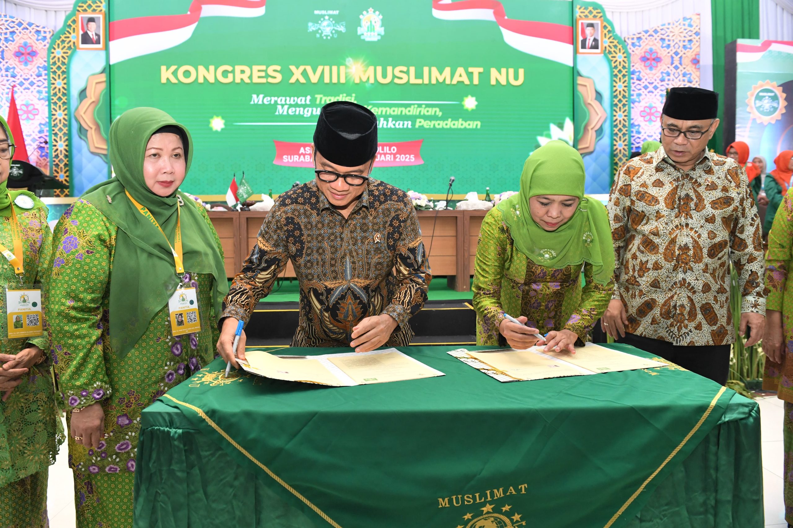 Menteri Desa dan Pembangunan Daerah Tertinggal (Mendes PDT) Yandri Susanto melakukan Memorandum of Understanding (MoU) bersama Ketua Umum Muslimat NU Khofifah Indar Parawansa.