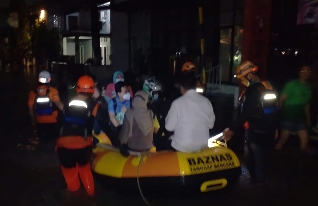 Badan Amil Zakat Nasional (BAZNAS) menerjunkan tim untuk membantu proses evakuasi korban banjir di Komplek IKIP dan Perum Jatibening Permai, Kota Bekasi, Jawa Barat, Selasa (5/4/2022). Sebelumnya, hujan dengan intensitas tinggi pada Selasa kemarin itu menyebabkan banjir menerjang sejumlah wilayah di Bekasi dengan ketinggian bervariasi, antara 100-150 cm.