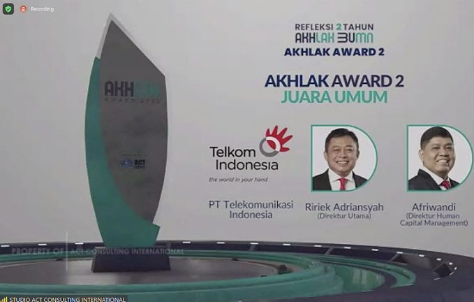 PT Telkom Indonesia (Persero) Tbk (Telkom) kembali membuktikan komitmennya dalam menerapkan core values BUMN – AKHLAK dengan meraih predikat juara umum pada AKHLAK Awards 2022. Ajang ini diselenggarakan Kementerian BUMN pekan lalu.