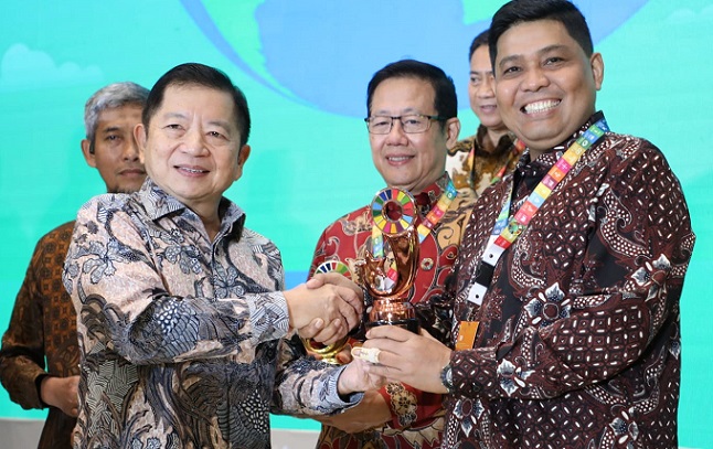 Penghargaan Indonesia’s SDGs Action Awards 2022 diserahkan oleh Menteri Bappenas Suharso Monoarfa (kiri) kepada Direktur Human Capital Management (HCM) Telkom Afriwandi (kanan) pada acara penganugerahan, Kamis (1/12/2022). Foto: humas Telkom