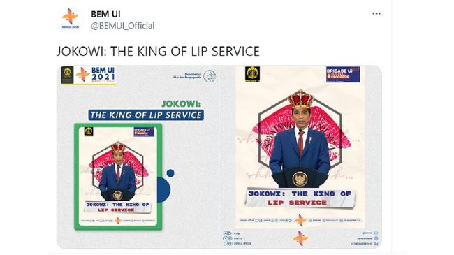 Terbaru, BEM UI menyebut Jokowi sebagai The King of Lip Service karena kerap mengumbar janji yang akhirnya tidak ditepati. Hal ini disampaikan BEM UI lewat postingan di akun Twitter-nya dan viral di media sosial.