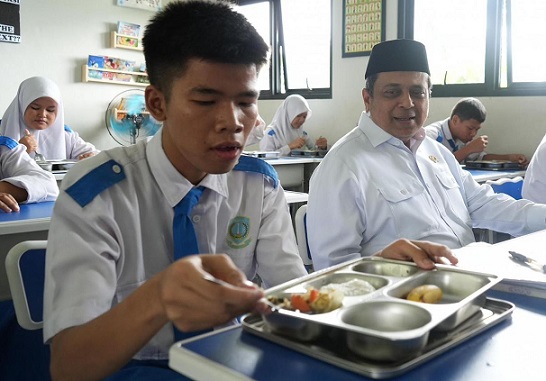 Kepala BPJPH Ahmad Haikal Hasan (pakai peci) saat mengunjungi salah satu sekolah yang sudah masuk Program Makan Bergizi Gratis. Foto: humas BPJPH