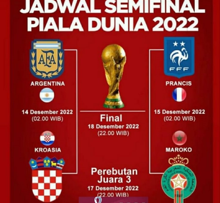 Jadwal siaran langsung Piala Dunia 2022 Qatar malam ini atau dini hari nanti pukul 01.30 di Stasiun SCTV, Indosiar, Champions TV, dan live streaming TV Online melalui platform Vidio.com partai semifinal antara Argentina vs Kroasia, Rabu (14/12/2022).