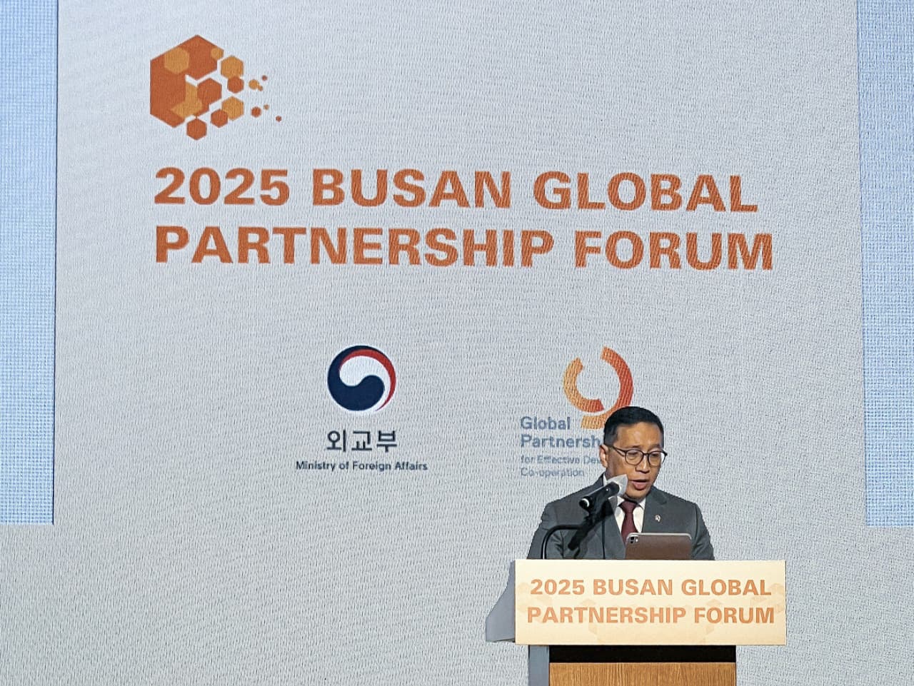 Wakil Menteri PPN/Wakil Kepala Bappenas Febrian Alphyanto Ruddyard menyampaikan sambutan pembuka pada ajang Busan Global Partnership Forum 2025 di Seoul, Korea Selatan, yang dihadiri perwakilan 100 negara dan organisasi internasional dunia.